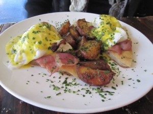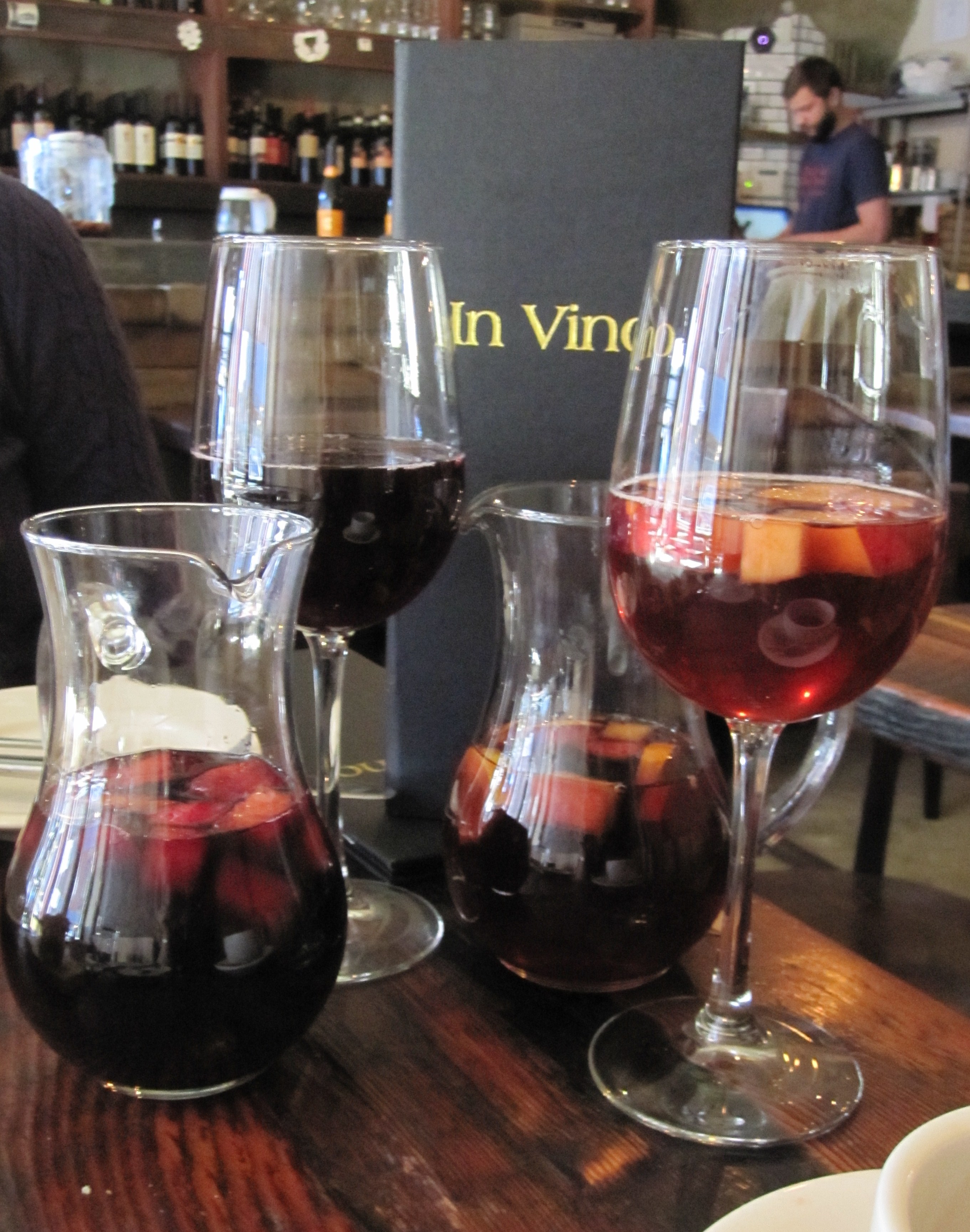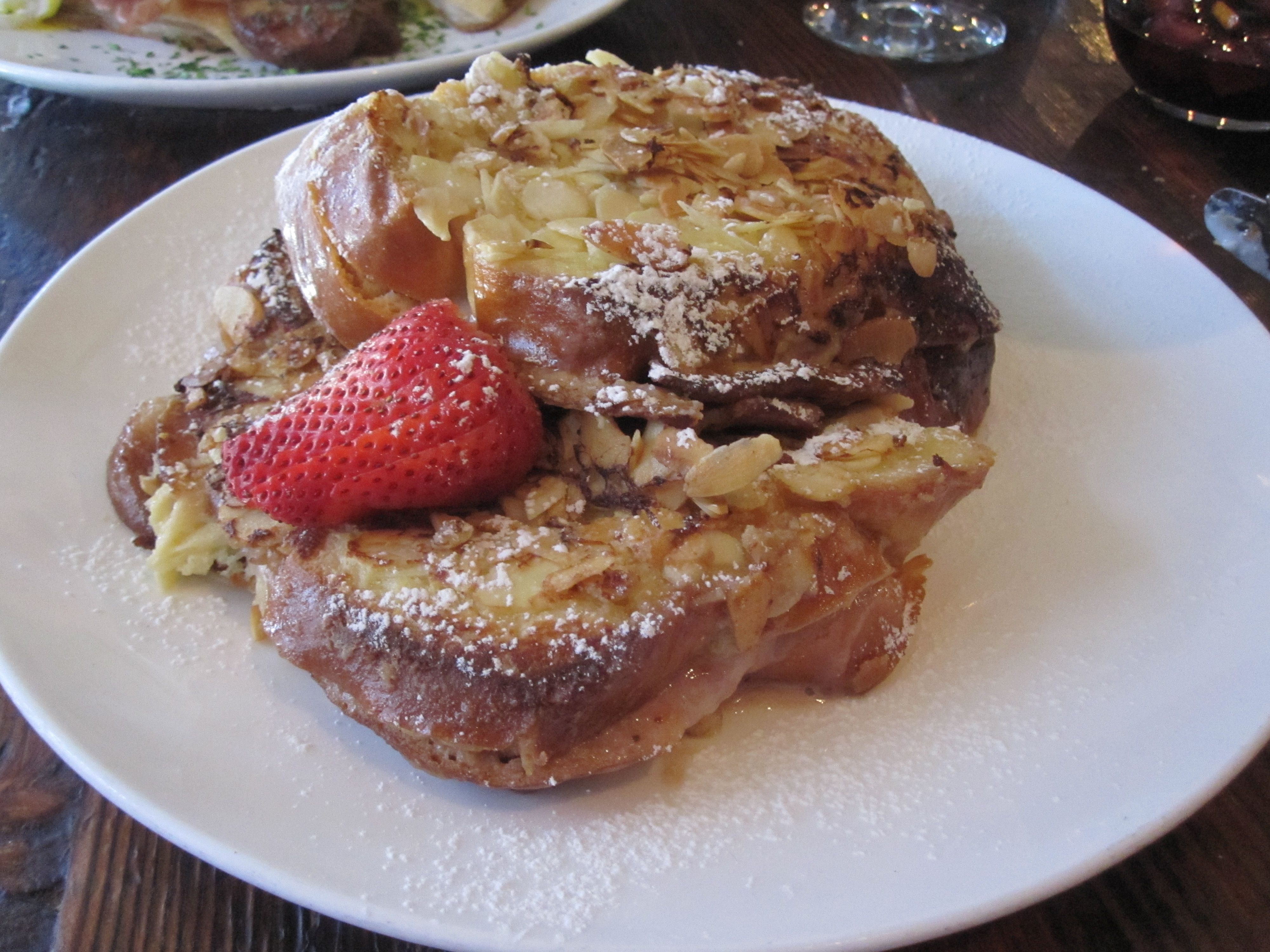 Though you lose the dark grotto-esque ambience that nighttime lends, weekend brunch at In Vino is still a hip scene with great eats. We started with customized mini-pitchers of sangria – I had the red and got a sparkling Prosecco topper (do it!). The brunch entrees were decadent – the Pane Tostato Mandorla ($10) French toast stuffed with strawberry + marscapone and THEN crusted with sliced almonds was completely over the top – I only got ½ way through but each bite was heaven. We also had the Uovo Benedetto ($11) – warm Poached Eggs on Rosemary Focaccia Toast w/ Grilled Prosciutto Cotto and Basil Hollandaise. Wowza.