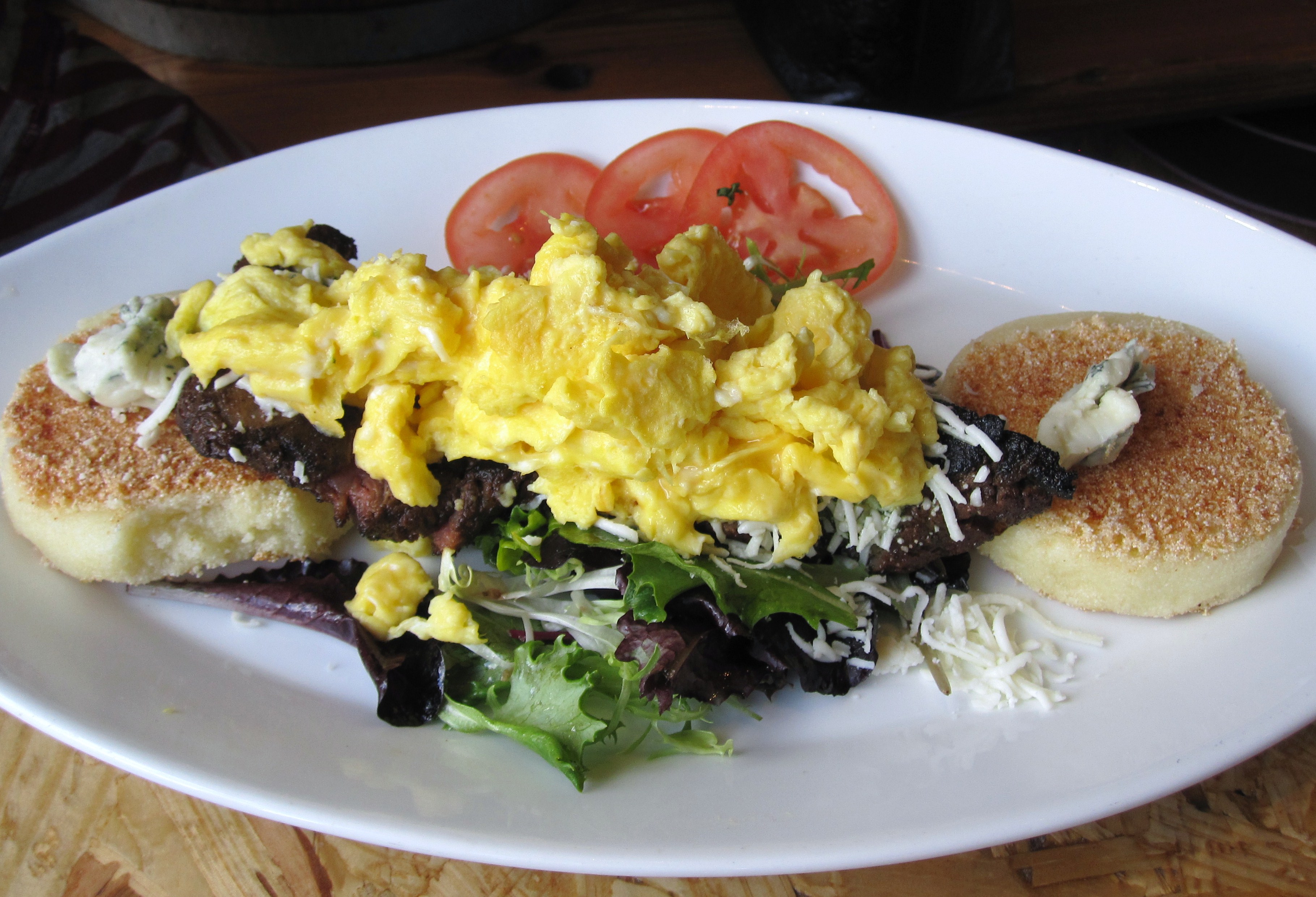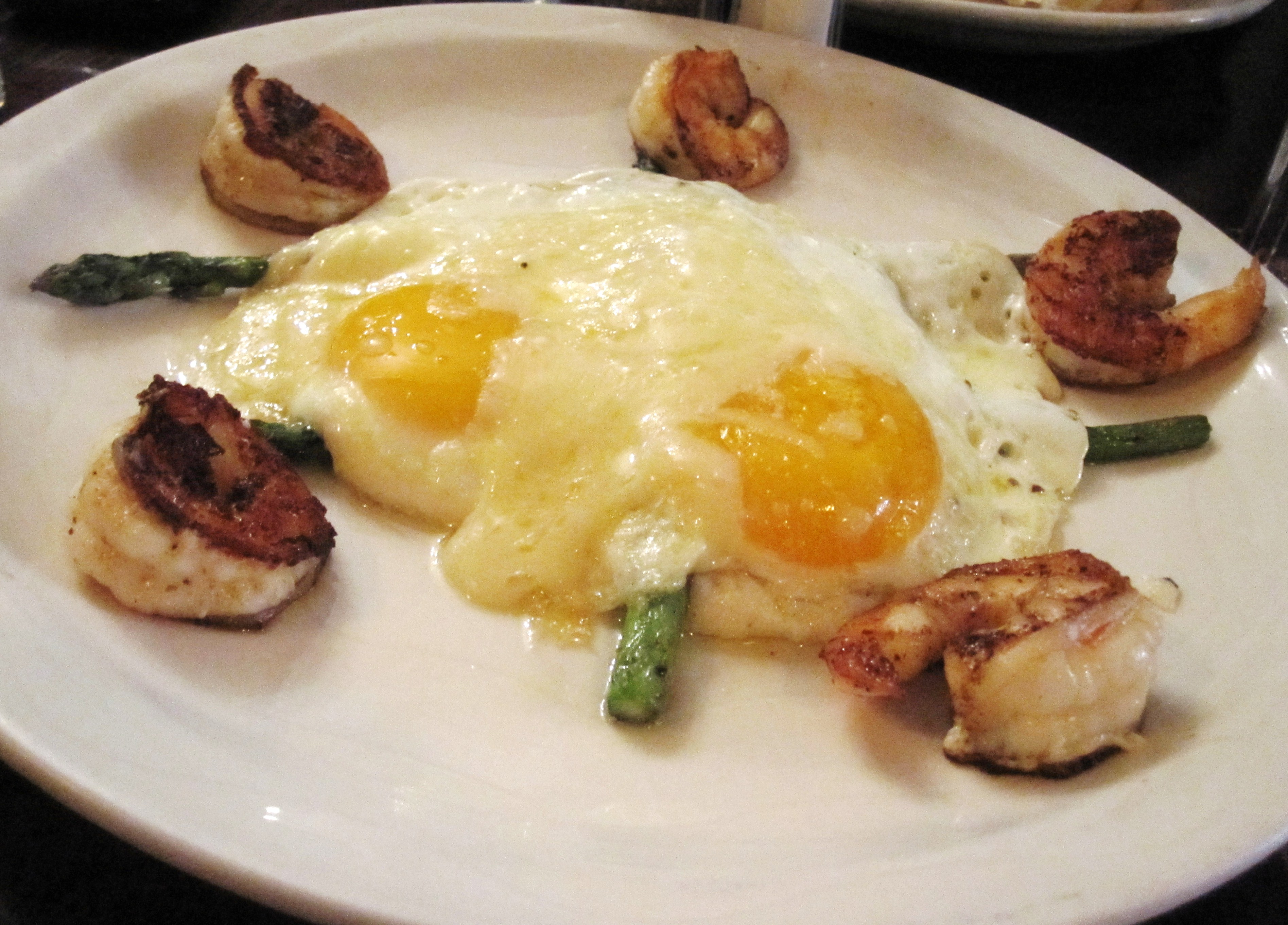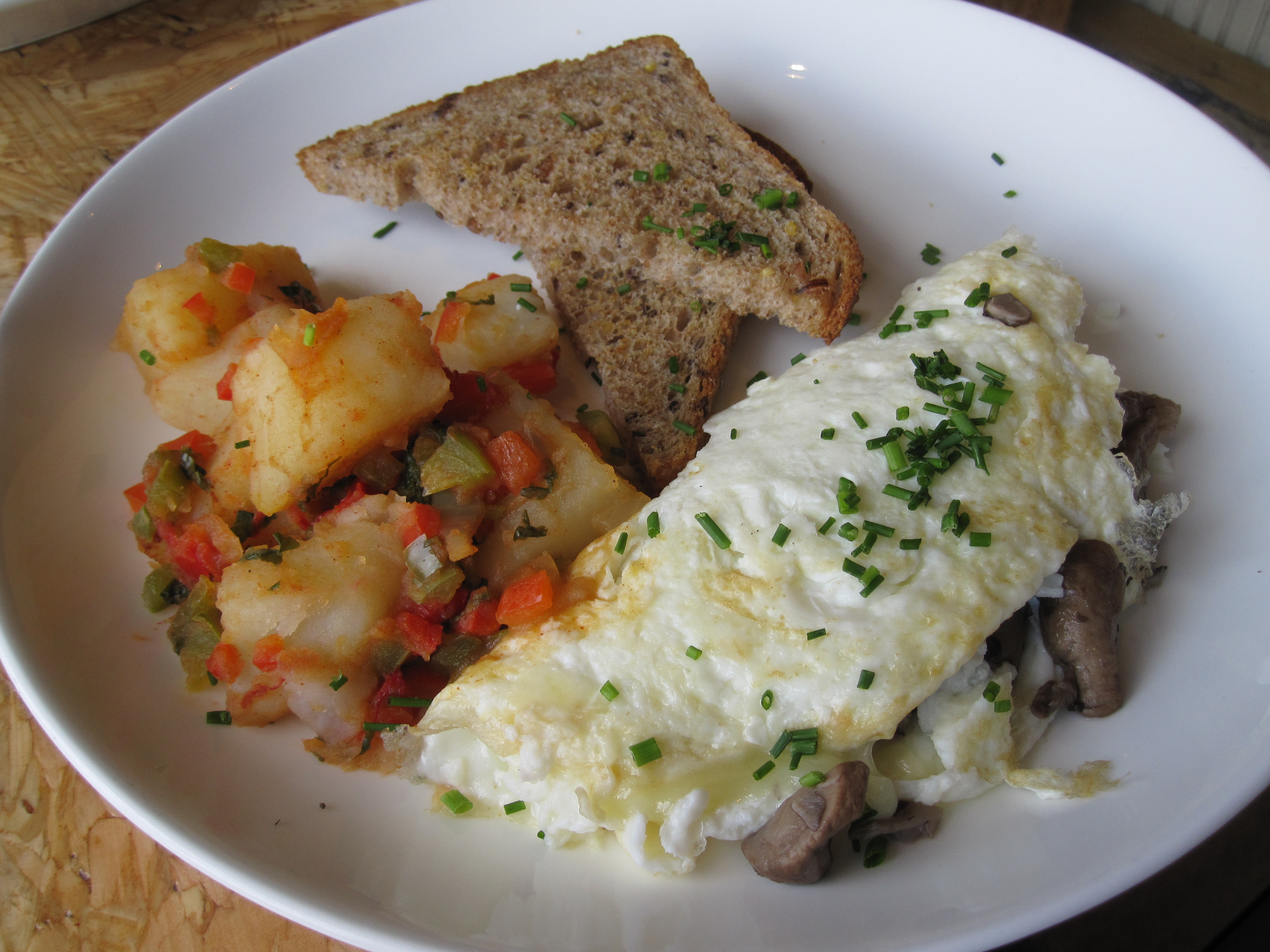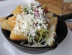We started with Yuca fries (think French fries but with much more fiber) – they were FANTASTIC served in a skillet with onions, Chimichurri sauce and queso fresco sprinkled on top. They’re in the “sides” section of the menu and are the perfect starter to share. My brunch date went with the Steak & Eggs which were a good sized portion (for $18, you’d hope it would be) that included 2 White Corn Arepas topped with Cabrales Cheese (the Arepas were good for a bite before the chalky consistency dried out my mouth – the one thing that I’d say they can work on). I was stuffed from the fries, which are a bit heavy, so I opted for a lighter option – the Manchego & Mushroom Omelet (I had whites) which comes with nutty toasted bread and home fries +peppers, a bargain at $10.